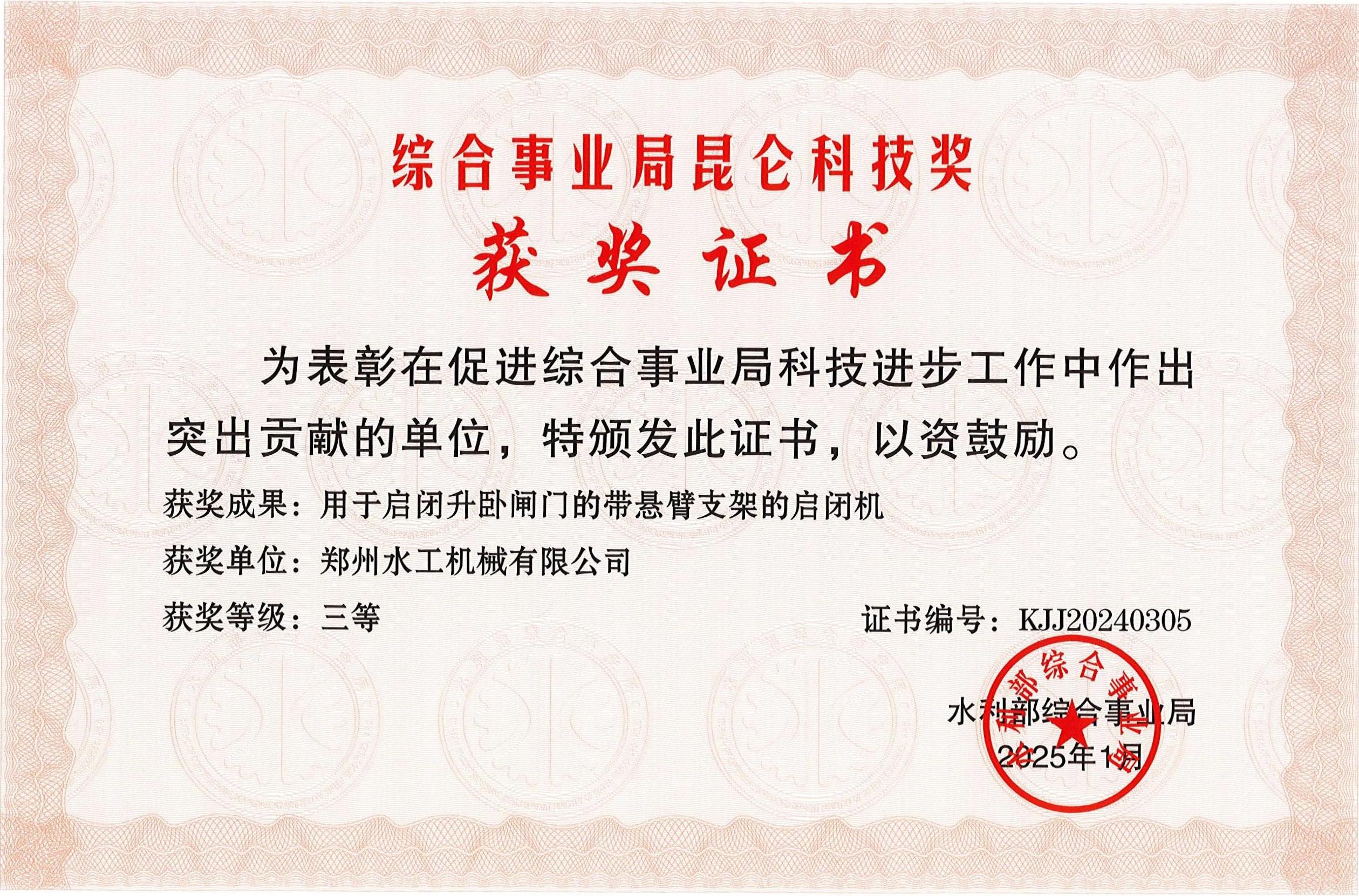 近日,集团公司所属郑州水工“用于启闭升卧闸门的带悬臂支架的启闭机”和重庆华正“基于干扰信号修正的智能流速测算仪研制”项目分别获综合事业局昆仑科技奖三等奖。