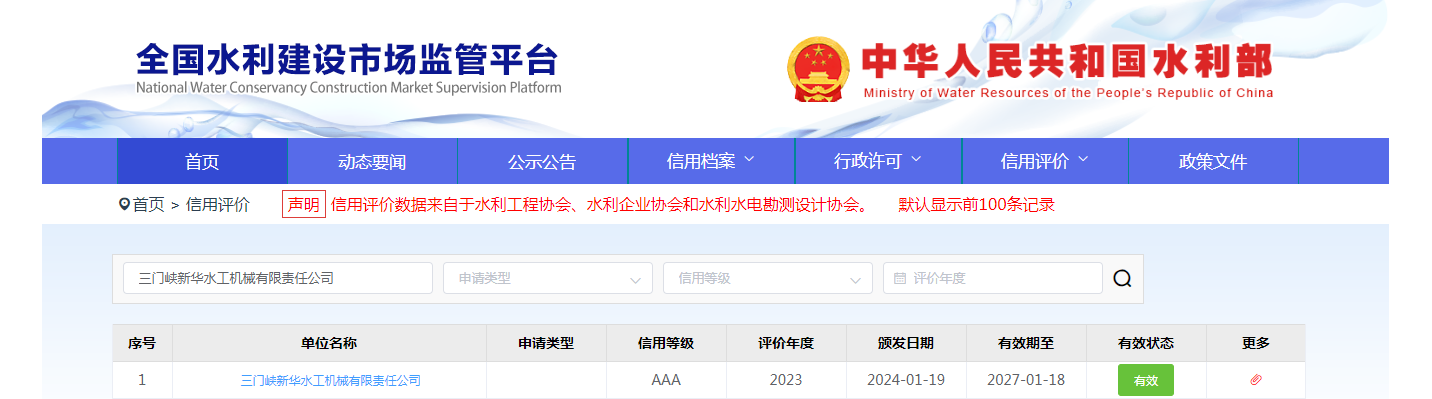 近日,中国水利企业协会发布了关于《2023年度水利建设市场主体(机械制造单位)信用评价结果》的公告,三门峡bv伟德官网水工机械有限责任公司(以下简称三门峡水工)凭借卓越的综合实力和良好的信用记录,顺利通过专家评审,荣获全国水利建设市场主体AAA级信用评价。